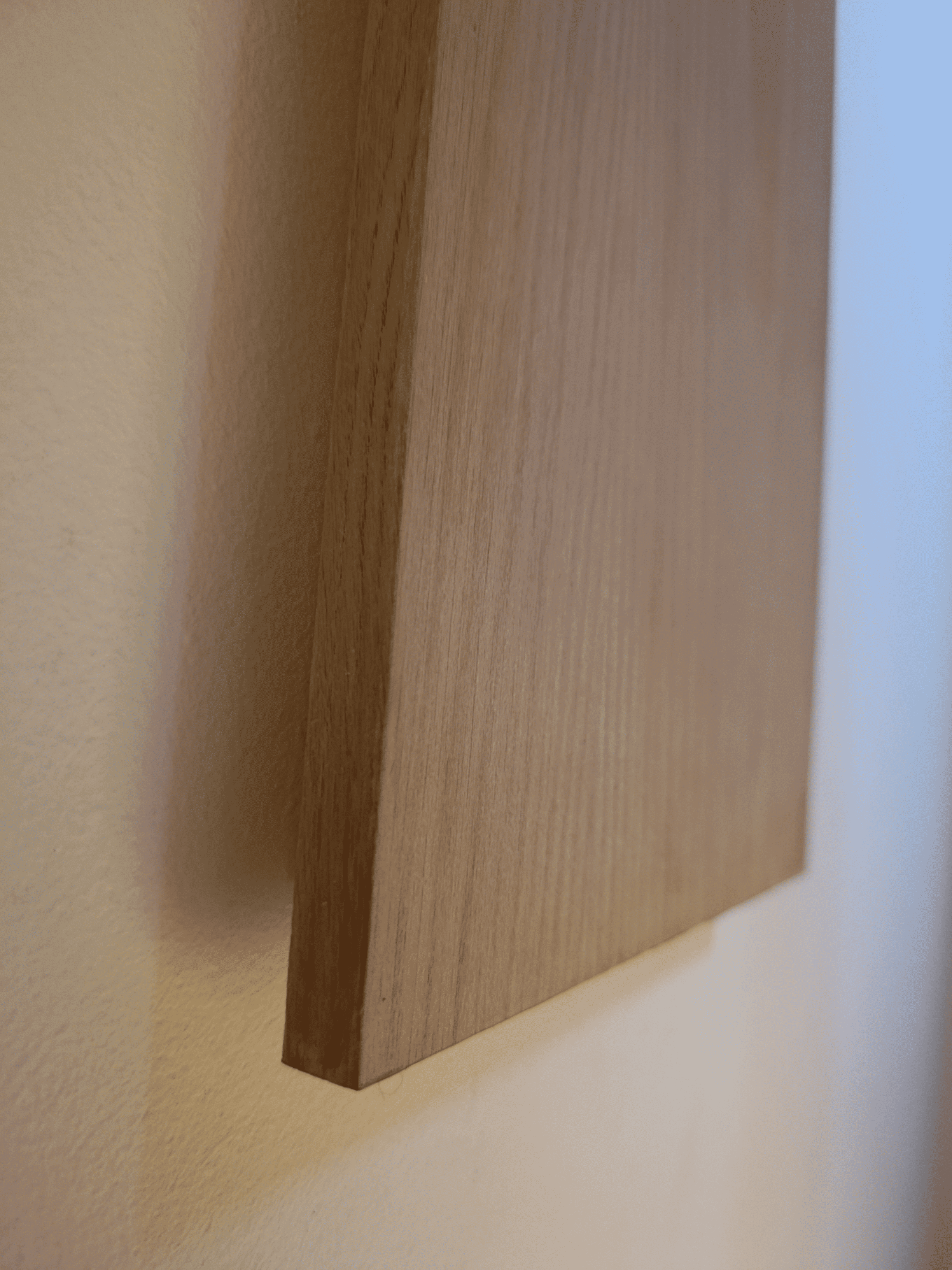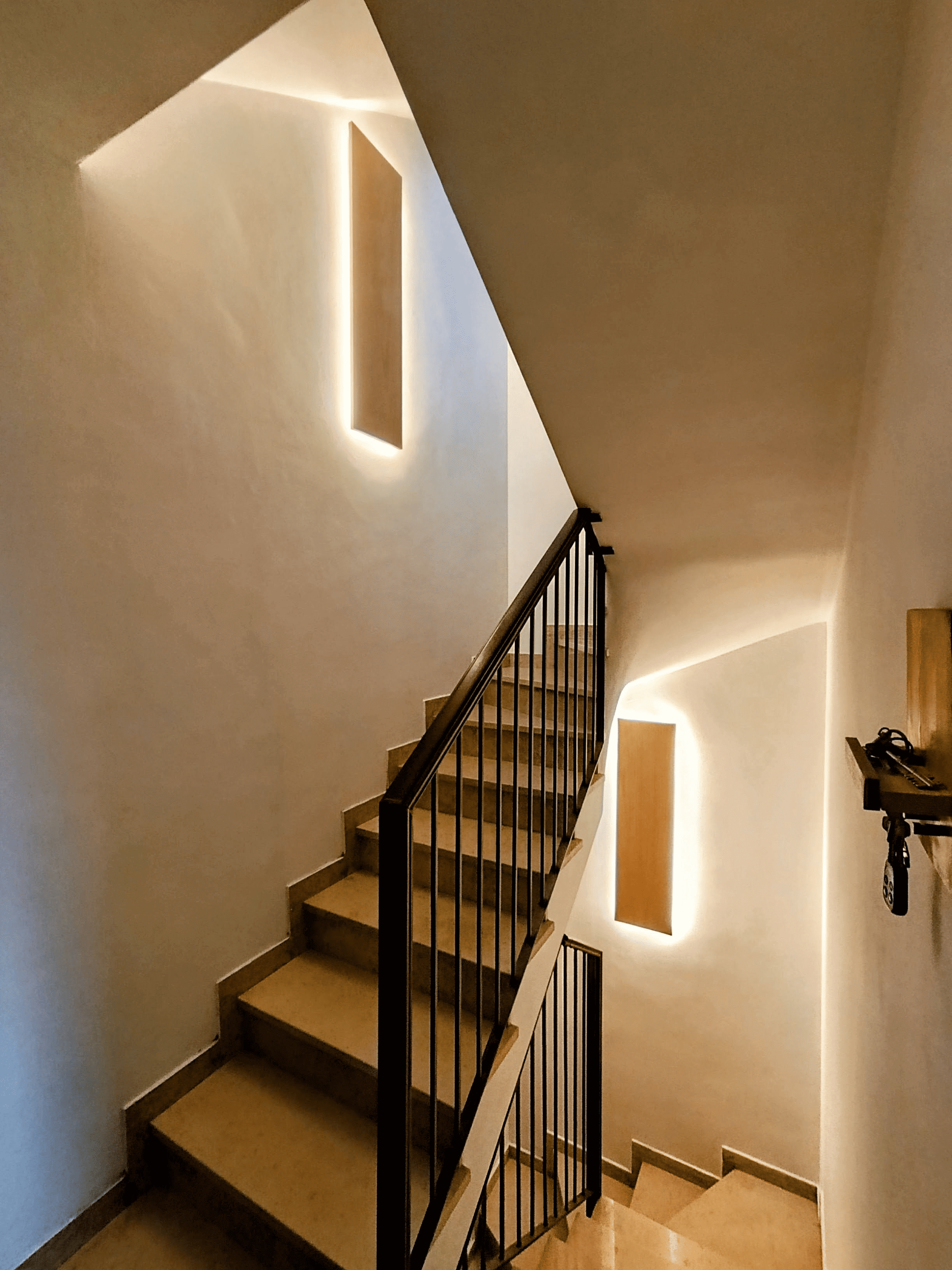 Queste applique a muro sono state progettate su misura per arricchire il vano scala, unendo la funzionalità dell'illuminazione alla bellezza del design artigianale. Realizzate in legno di rovere massello, sono pensate per integrarsi armoniosamente con l'architettura della casa, creando un percorso luminoso caldo e accogliente.